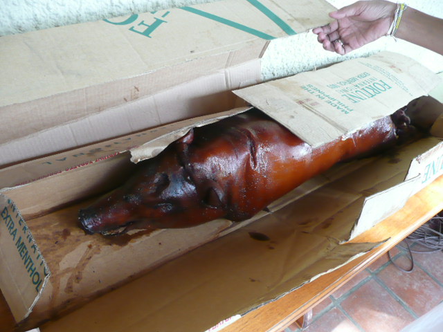 丸焼きの豚さんとも記念撮影!あっ手をつないでるのは、マグダンです。(笑)