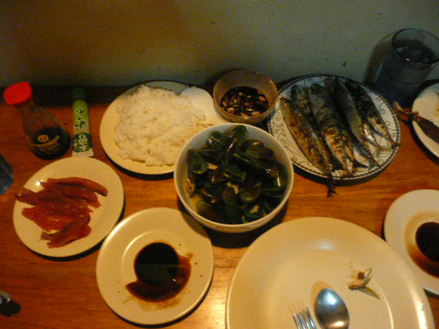 でっ、今晩はこんな感じの夕食! 鯵の刺身に、焼き魚、ムール貝!美味しかったよ~